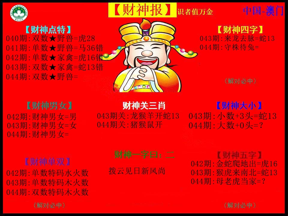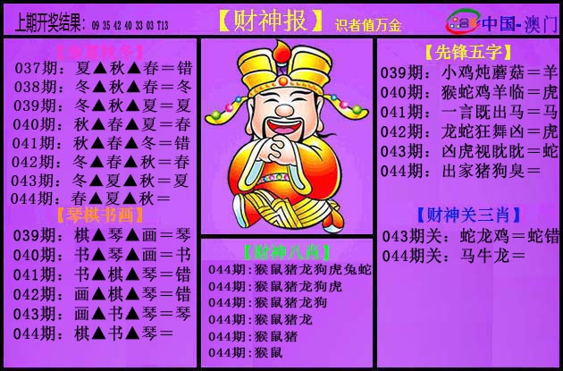044期:【神算仙子】♠【半波中特】精选高手 |